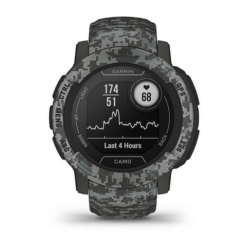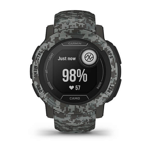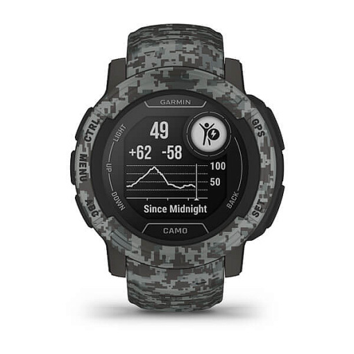 | Instinct® 2 Camo Edition est montre GPS robuste et connectée avec un design camouflage audacieux, Smart Notifications, des fonctions de suivi de l'état de santé 24 h/24 et 7 j/7, la prise en charge GNSS multiple et bien plus encore. |