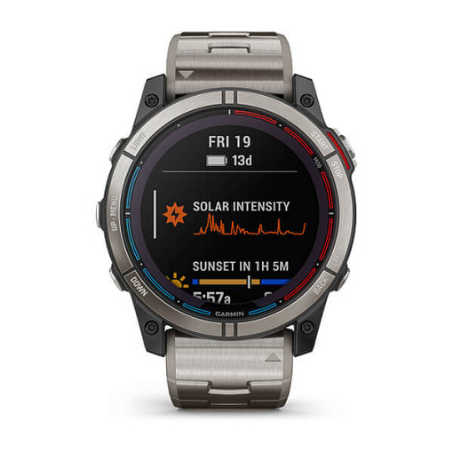 | Autonomie de la batterie | Mode montre connectée : jusqu'à 28 jours/37 jours avec la recharge solaire* Mode montre économie d'énergie : jusqu'à 90 jours/plus d'un an avec la recharge solaire* Mode GPS seul : jusqu'à 89 heures/122 heures avec la recharge solaire** Tous les systèmes satellites : jusqu'à 63 heures/77 heures avec la recharge solaire* Tous les systèmes satellites et multibandes : jusqu'à 38 heures/42 heures avec la recharge solaire** Tous les systèmes satellites et la musique : jusqu'à 16 heures Mode GPS batterie maximum : jusqu'à 213 heures/578 heures avec la recharge solaire** Mode GPS expédition : jusqu'à 62 jours/139 jours avec la recharge solaire* *Recharge solaire, avec une utilisation quotidienne, 3 heures par jour à l'extérieur, en plein soleil (50 000 lux) **Recharge solaire, avec une utilisation en plein soleil à 50 000 lux |
